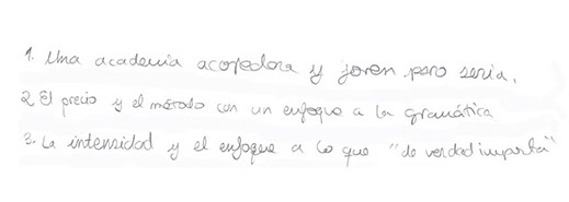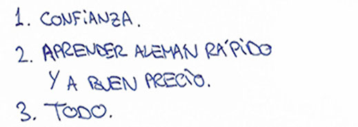 Antes pensaba que el alemán era una lengua muy difícil y que me llevaría mucho tiempo aprenderla. Pero he descubierto que no era así, sino que se trata de una lengua muy lógica. Y además, aprender alemán es más fácil gracias a la labor de los profesores, que en todo momento han sido muy amables y han sido atentos con los alumnos, resolviendo todas nuestras dudas y además explicando con total claridad los conceptos de la lengua alemana. Por ello, opino que mi experiencia en VEITH Institut de Madrid ha sido muy buena, y espero seguir aprendiendo alemán en él.