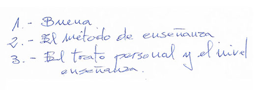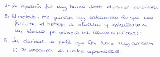 En cuanto al método novedoso VEITH estoy muy contenta, los resultados los hemos obtenido de una forma muy rápida. Ahora solo queda asentar los conocimientos practicándolos. Comparado con otras escuelas la relación calidad precio es muy buena puesto que lo que en otros institutos se aprende en años aquí lo hemos aprendido en 6 meses. Es un curso muy completo, donde se enseña toda la gramática y los alumnos aprenden a desenvolverse en las conversaciones cotidianas en alemán. En definitiva, es un programa que merece la pena porque se obtiene un nivel B1 en muy poco tiempo, siempre y cuando, aparte de en la academia, también se estudie y se repase en casa. Otro aspecto muy positivo es que hemos tenido la suerte de contar con un profesor fantástico y siempre disponible que ha sabido explicarnos la materia con mucha paciencia y de una forma muy clara. Hemos recibido siempre un trato muy amable y comprehensivo por su parte lo cual favorece el aprendizaje. En definitiva: una buena experiencia, que tras mucho esfuerzo ha desencadenado muy buenos resultados.