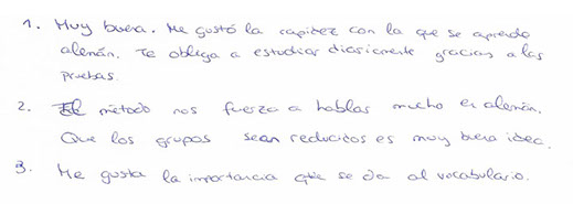 Además el profesor fomenta que cada alumno practique el alemán oralmente en cada clase. La suma del alto nivel gramatical, junto con la permanente práctica oral, da lugar a un curso intensivo y eficaz. Se avanza en ambos aspectos de un modo constante. Al escribir ocurre lo mismo; se comienza por frases aisladas y se llega progresivamente a ser capaz de construir grandes textos de diferentes temáticas, ayudados por el vocabulario.